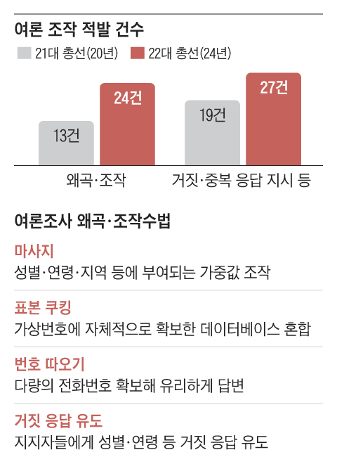 중앙선거관리위원회 산하 중앙선거여론조사심의위원회(여심위)에 따르면, 22대 총선 국면에서 실시된 여론조사 중 ‘조사 결과 왜곡·조작’이 24건, ‘거짓·중복 응답 유도’ 등은 27건으로 집계됐다. 이 조사들은 특정 후보에게 유리하도록 연령대별 가중치를 부여하거나 왜곡된 표본을 쓴 것으로 드러났다.