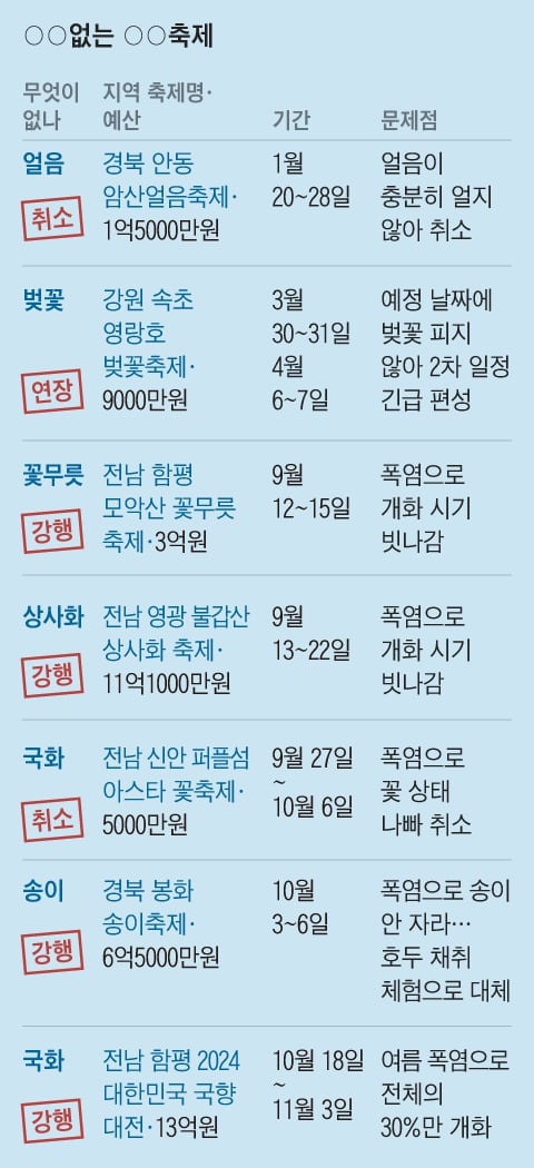지난달 중순 전남 함평군 ‘모악산 꽃무릇 축제’와 전남 영광군 ‘불갑산 상사화 축제’도 모두 이상기후 탓에 모두 ‘꽃 없는 꽃 축제’가 됐다. 강원 속초시는 올해 벚꽃 개화 시기를 3월 30~31일로 예상하고 벚꽃 축제 일정을 잡았지만 결국 빗나갔다. 결국 4월에도 추가로 축제를 열었다. 지난 3일부터 열린 경북 봉화군의 송이 축제도 여름 폭염과 고온 다습한 날씨로 송이 농사를 망치면서 송이 채취 체험 행사를 취소했다. 대신 호두 채취 프로그램을 마련했다.