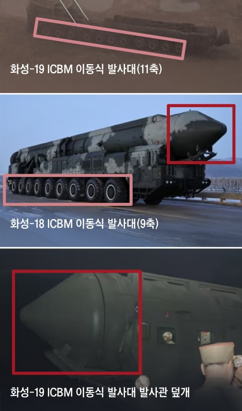 조선중앙통신에 공개된 사진과 국민의힘 유용원 의원실 분석 자료를 보면 북한은 화성-19형을 11축 이동식발사대(TEL)를 이용해 발사했다. 9축 TEL에서 쏘는 화성-18형보다 길어진 모습이다. 유용원 의원실은 “신형 ICBM 화성-19는 화성-18의 탄두탑재부 공간과 길이가 확장한 형태로 보인다”며 “2~3단 길이를 늘려 연소 시간을 늘인 것으로 추정된다”고 했다.